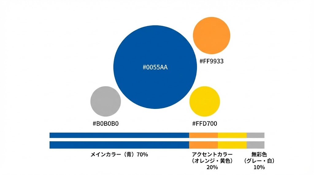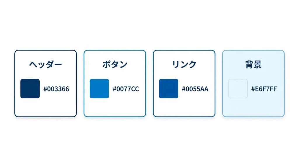 どの青を使うか迷ったときは、「信頼重視ならネイビー方向」「親しみ重視ならライトブルー方向」と、まずは方向だけ決めてから具体的なコードを調整していくと決めやすいです。