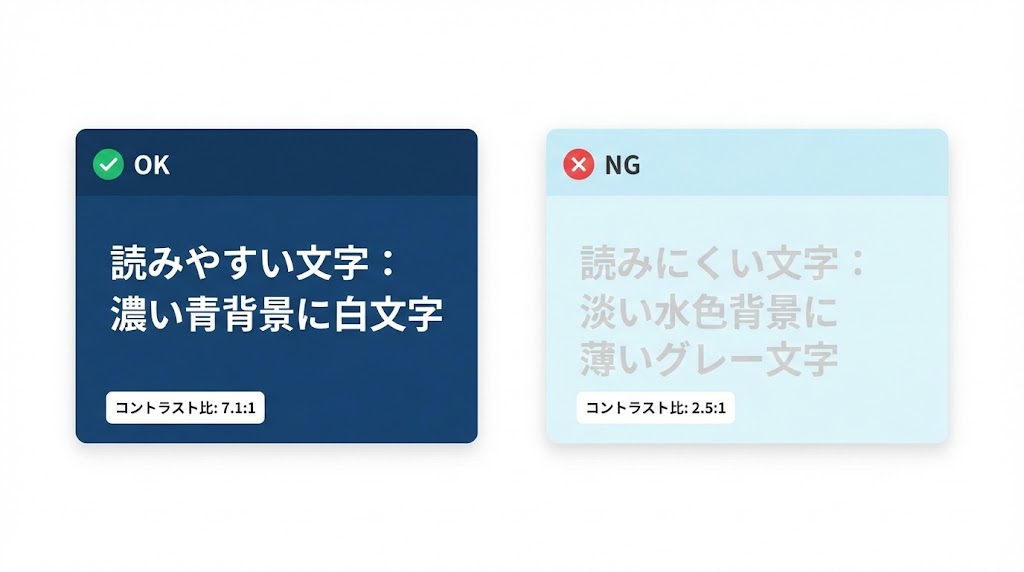 • 小さな本文テキストには、コントラスト比4.5:1以上を満たす濃い青+明るい背景の組み合わせが安心