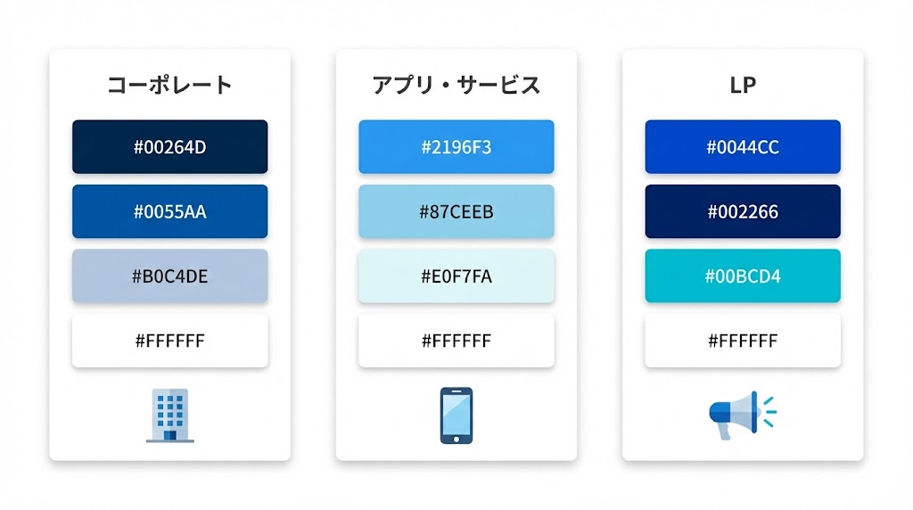 ここでは、目的別にどのあたりの青を軸にするとイメージが揃えやすいかを整理します。