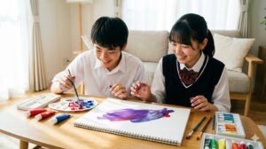 不透明水彩では、学童用かガッシュかによって発色が変わるので、少し鮮やかめの組み合わせからスタートして、必要に応じて白や黒で調整していくのがスムーズです。