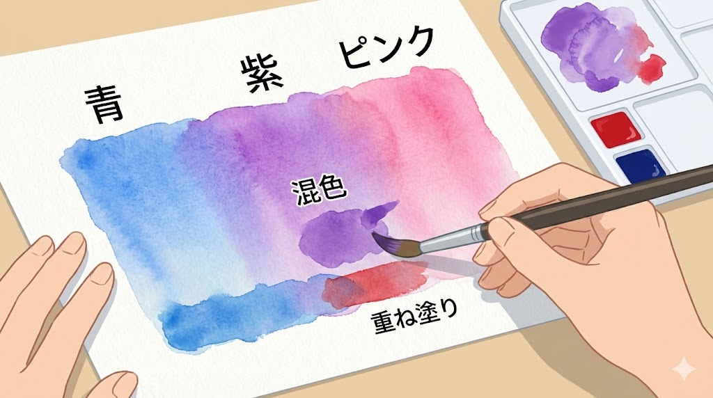 このページでは、絵の具で紫色を作る方法を、不透明水彩と透明水彩それぞれの混色レシピとして丁寧に整理していきます。