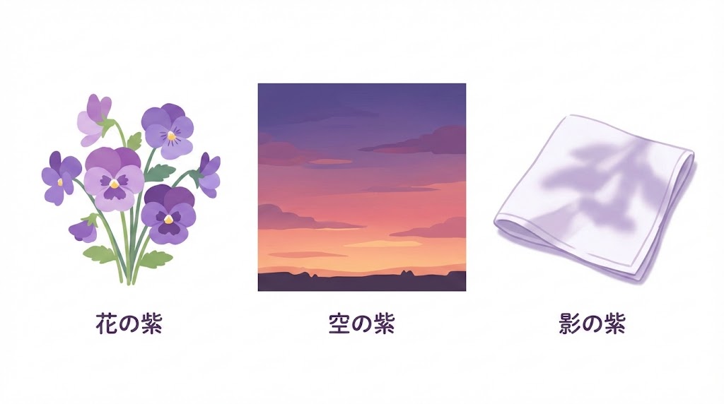 最初に押さえたいのは、「紫は単なる赤と青の中間」ではなく、色相・明度・彩度という三つの要素のバランスで決まるという考え方です。