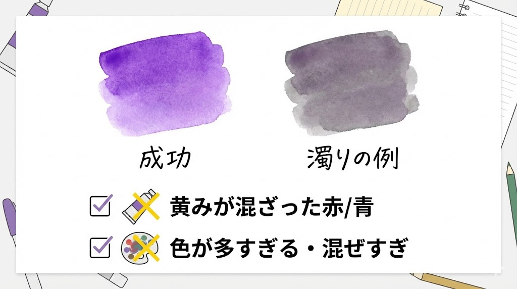 A. 黄みの強い色が混ざっていないかを確認するのが近道です。パレットに残っているきいろや黄土色が少しでも混ざると、補色関係で茶色寄りになりやすいので、赤と青を置く位置を離したり、筆をしっかり洗ってから混色するようにすると改善しやすくなります。