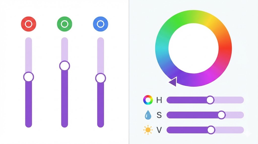 RGBはマシン側の仕組みに近い表現、HSVは人の感覚に近い表現と考えておくと、「設計はHSV、最終チェックはRGB・HEX」という役割分担がはっきりします。