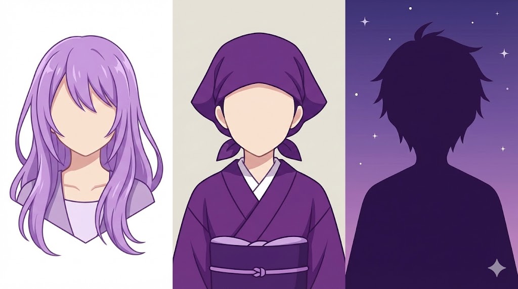 シーン別に見ると、髪色にはやや低彩度・中明度の落ち着いた紫、衣装や小物には高彩度・やや明るめの映える紫、背景や夜空には青寄りで低明度の静かな紫が、それぞれ使いやすい目安になってくれます。