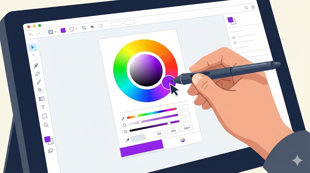 実際に紫を作るときは、使っているペイントソフトのカラーピッカーの仕様を知っておくと、欲しい色にたどり着くスピードが上がります。