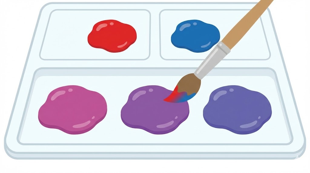 いろいろな色を足したくなってしまうタイミングで「今日は赤と青だけでどこまで紫を作れるか試してみよう」とテーマを絞ると、失敗のストレスを減らせます。