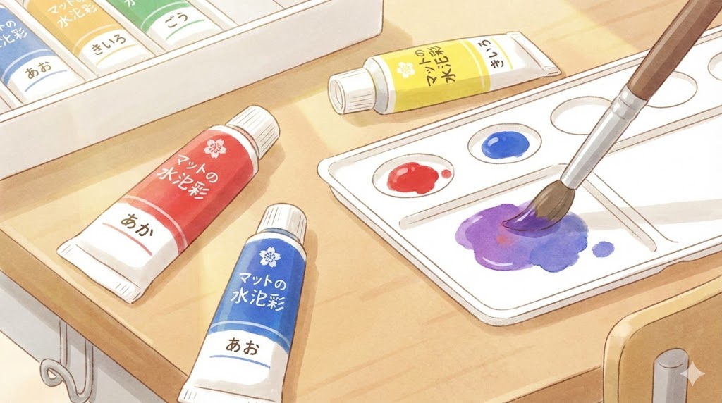 そこでこの記事では、サクラ系マット水彩やぺんてるのエフ水彩などの学童用セットを中心に、手持ちの絵の具だけで紫を作る代用レシピを、セット別・用途別に整理して紹介していきます。