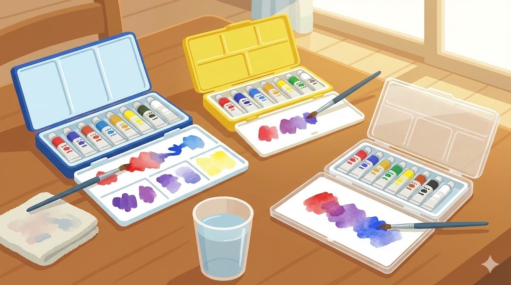ぺんてるやトンボなど他メーカーの学童用水彩セットでも、基本は「赤系+青系」で紫を作る考え方は変わりません。
