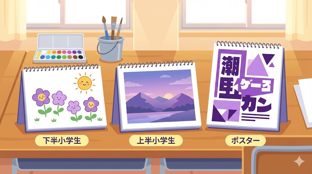 学年が上がるほど「複雑な紫」を作れるようになりますが、どの学年でも「まずはその画材で色見本を作る」という一手間が、作品全体の仕上がりを大きく左右します。
