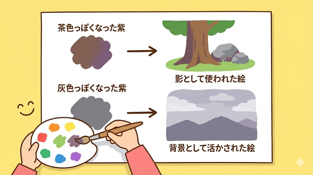 | 茶色っぽい紫 | 黄みの多い赤や青を混ぜすぎた | 青を少し足して青紫寄りにし、影や背景に使う |