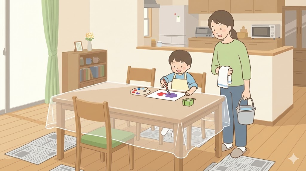 テーブルにビニールシートや新聞紙を敷き、服は汚れてもよいエプロンやスモックにしておくと安心です。