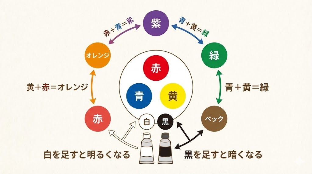 三原色と白黒は「色の材料セット」として考えると整理しやすく、どの色をどの材料から作るかイメージしておくと混色の迷いが減ります。