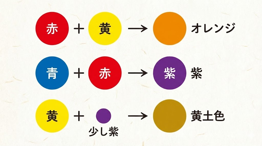 レシピ通りの混色だけでなく、ゲームや自由研究の題材として「混ぜてみて発見する」時間も楽しみながら、自分だけの色づくりノートを育てていってみてください。
