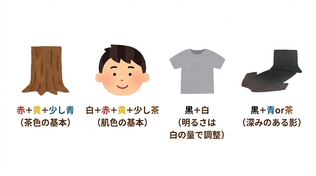 • 茶色や肌色は「赤+黄+少し青」をベースに、白や赤黄の量で微調整します。