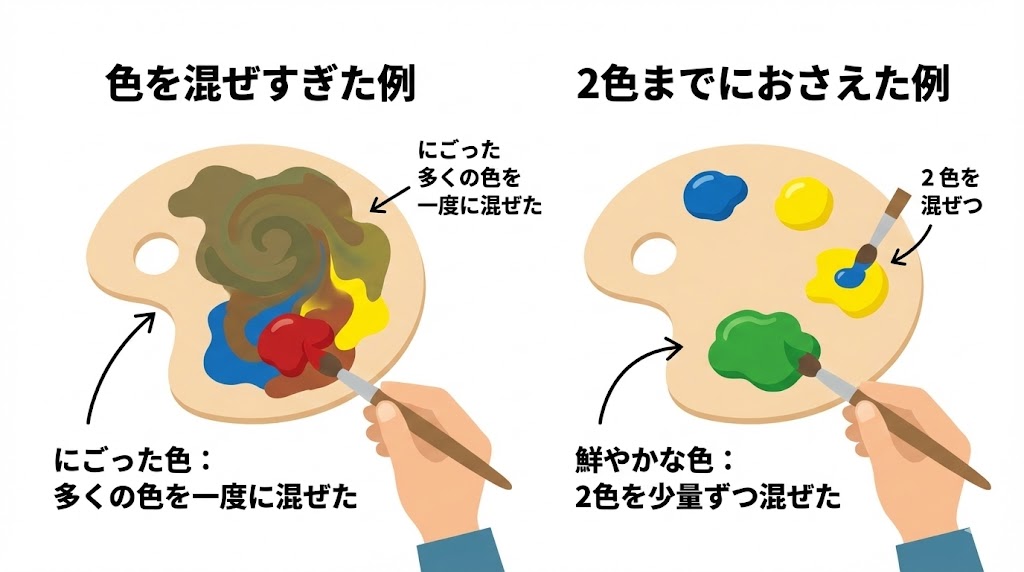 色がにごりやすいと感じるときは、混ぜる色の数を減らすことと、明るい色をベースに少しずつ濃い色を足すことを意識すると、失敗がぐっと減ります。