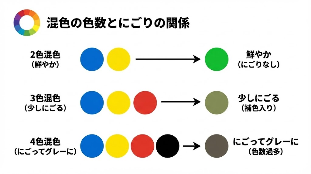 最初に押さえておきたいのは「色がにごる一番大きな理由は、混ぜる色が多すぎること」という点です。