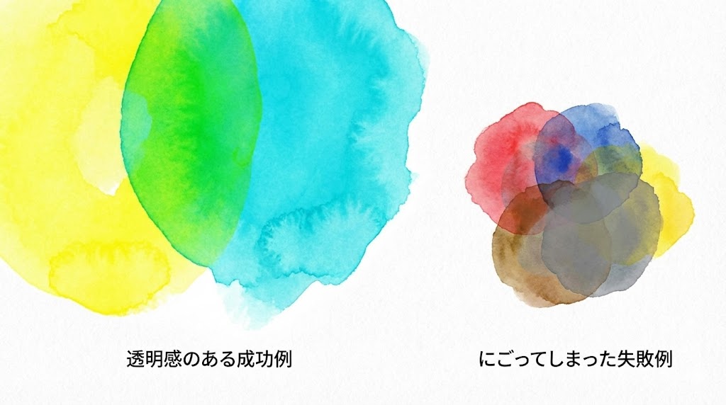 にごりやすさの傾向重ねすぎると紙の白が隠れて重くなる色数とメディウム次第でマットにくすみやすいパレット上で混ぜすぎると重くなりやすい