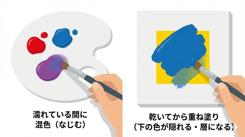 • アクリルは「濡れているうちの混色」と「乾いてからの重ね塗り」を分けて考えると結果が安定する。