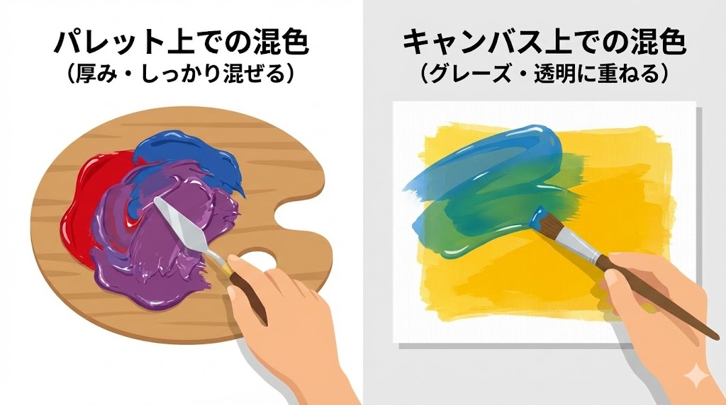 透明水彩では、二つの混ぜ方を意識しておくと整理しやすくなります。