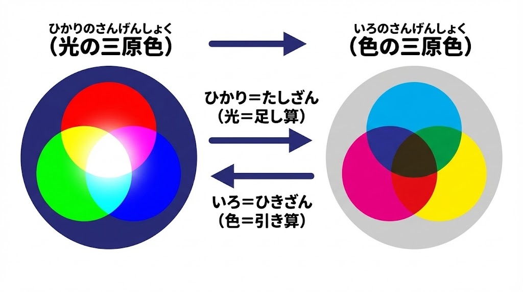 実は、光の三原色と色の三原色は「足し算で白に近づくグループ」と「引き算で黒に近づくグループ」という、しくみの違いさえ押さえればスッと整理できます。