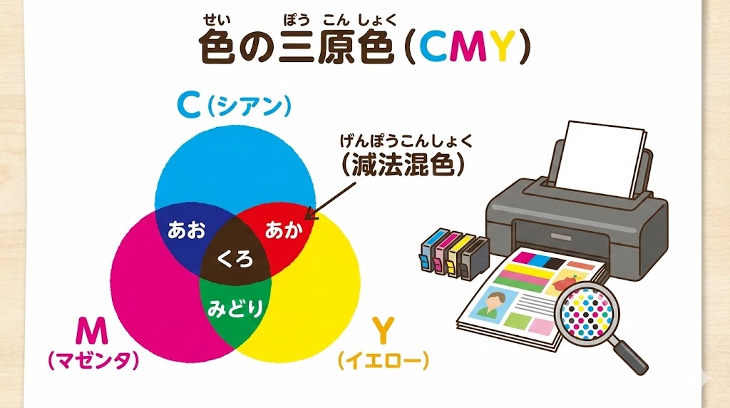 CMYだけでなく黒(K)を足すのは「インクの節約」と「きれいな黒を出すため」という二つの理由があると押さえておくと、プリンターの仕組みを説明するときに説得力が増します。