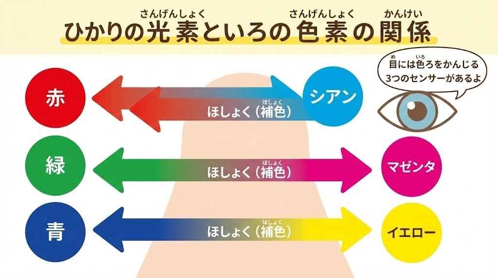光の三原色と色の三原色は、どちらも「たくさんの色を作るための三人組」ですが、光を足すグループか、光を引くグループかという点で性格が大きく違います。