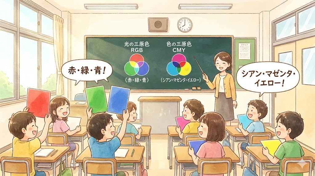 多くの子供は「三原色=赤・黄・青」と習った記憶を強く持ちやすく、そのままプリンターや理科の話に持ち込んでしまいがちです。