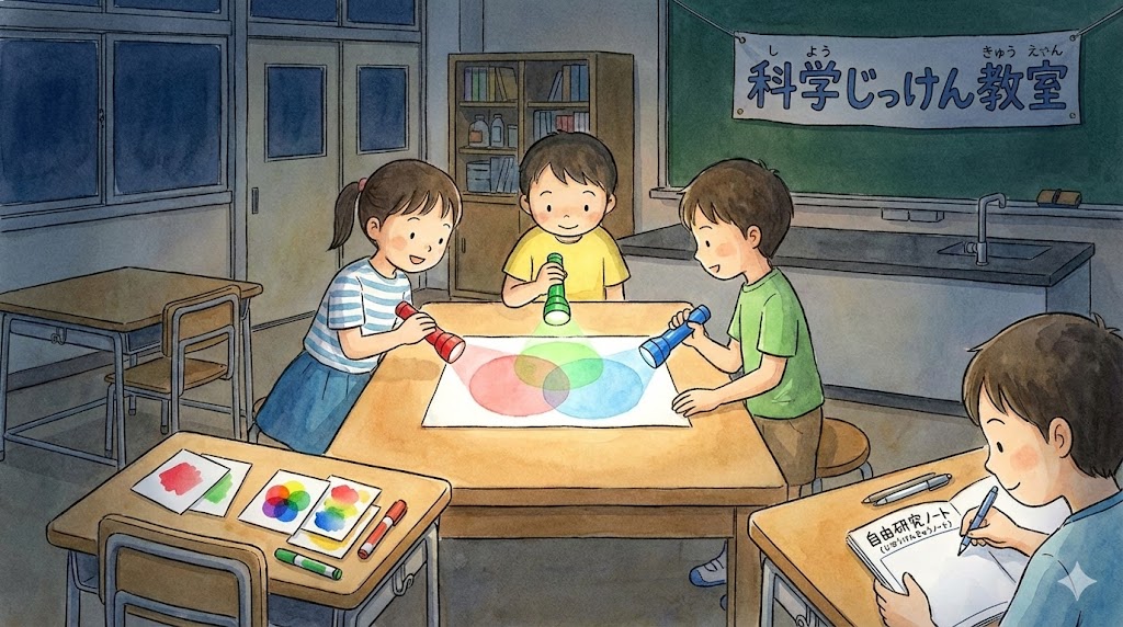 | 高学年 | 加法混色・減法混色と補色 | 簡単な実験・自由研究レポート |