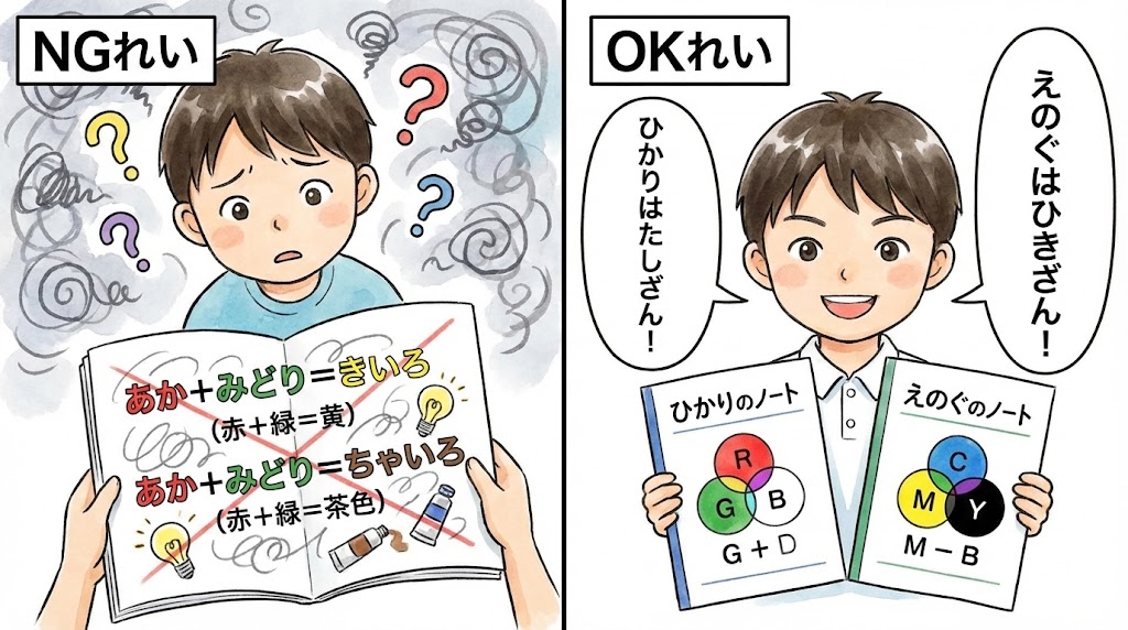 「三原色=赤・黄・青」とだけ教えると、印刷や理科でCMYが出てきたときに必ず混乱するため、早めに「学校の絵の具用」「印刷や理科用」という二つのグループがあると整理してあげることが大切です。