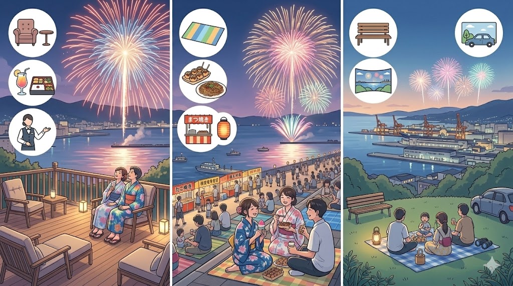 観覧場所は、「一番近い場所を探す」より「自分に合う見方を選ぶ」ほうが失敗しにくくなります。姫路みなと祭海上花火大会では、有料席を使うか、混雑を受け入れて近くで見るか、帰りやすさ重視で少し離れて見るかの3方向で考えると整理しやすいです。