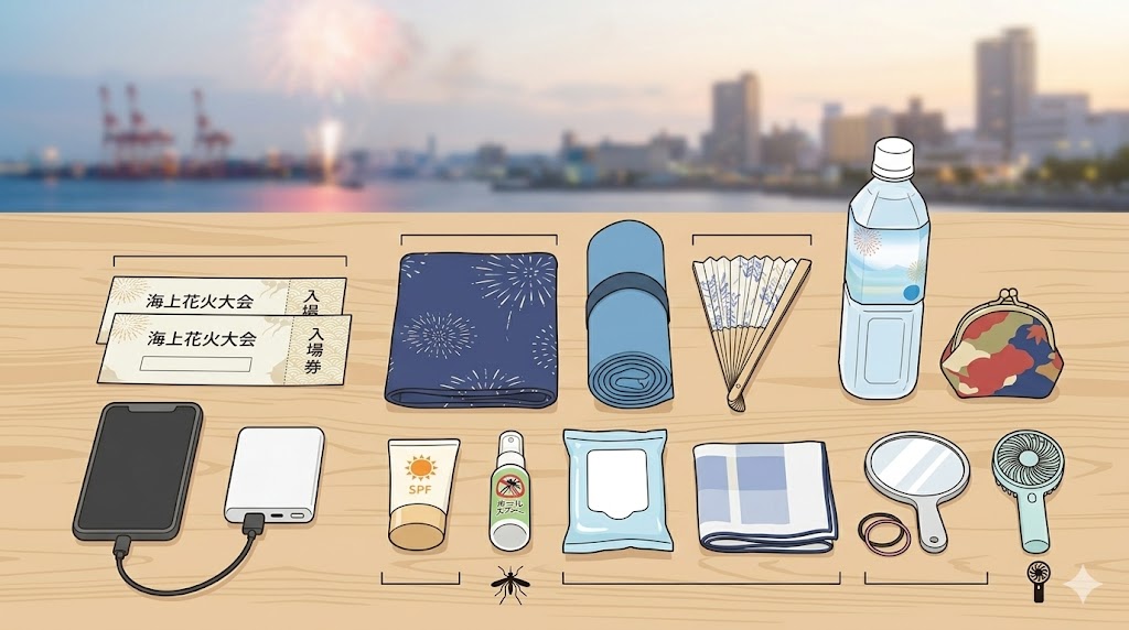 最後に、当日に迷いやすい部分を持ち物と行動で整理しておきます。姫路みなと祭海上花火大会は会場までの徒歩や待機時間もあるため、花火を見る装備というより、移動と待ち時間に耐えやすい準備が大切です。