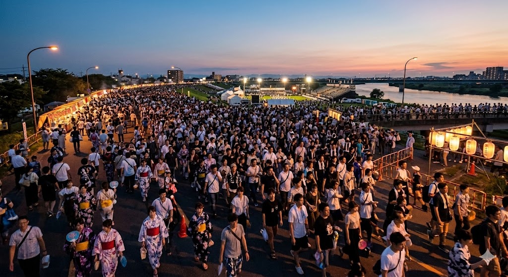 一般的に花火大会は、打ち上げ開始前の現地入りと、終了直後の帰宅開始で人の流れが集中します。直近の公式案内でも複数の観覧場所と専用駐車場が設定されており、来場者が特定時間に集中しやすい構造です。