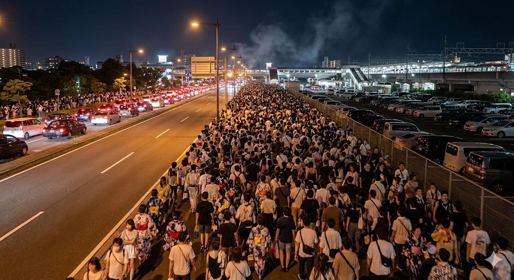 帰りが混むのは、花火終了が来場者の行動開始の合図になるからです。しかも、会場近くで見ていた人ほど、同じ方向へ同じタイミングで動きやすくなります。
