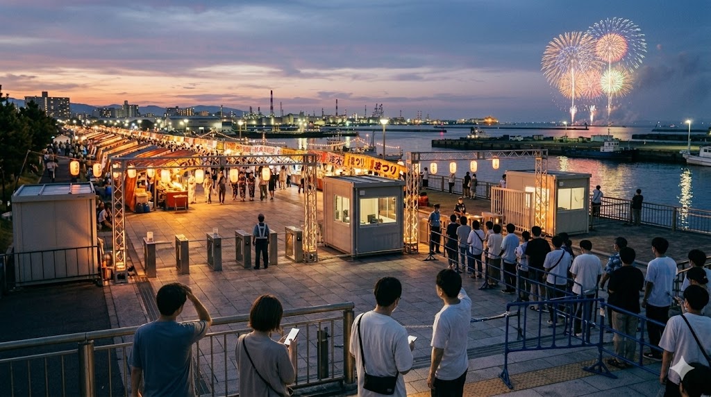 公式案内では、会場エリアは姫路港(飾磨地区)周辺に設定され、北エリア・南エリア・東エリアの入場ゲートが設けられる構成です。そして露店も、その会場エリア運用の中で楽しむ前提になっています。