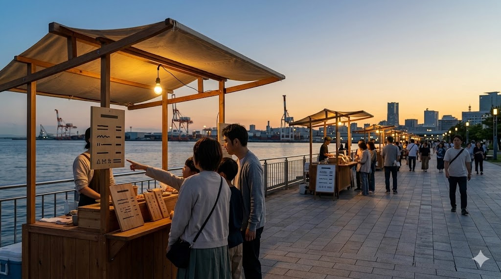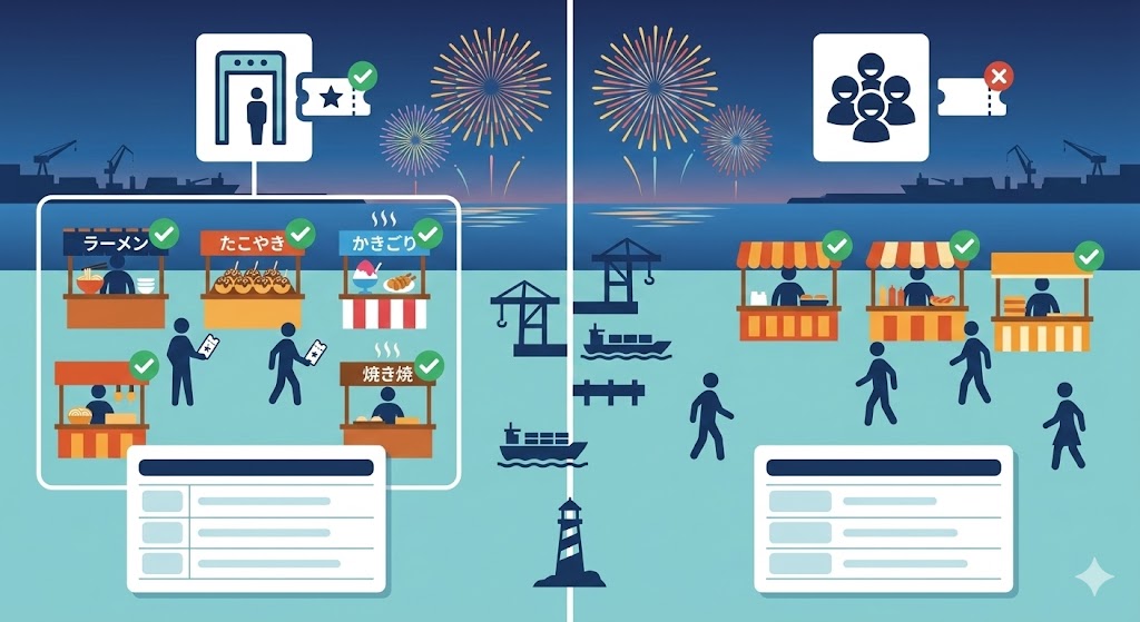 そのため、「港の周辺に行けば誰でも屋台が並んでいる」と広く考えるより、会場内での利用を前提に読むほうが実態に近いです。屋台の細かな配置や店舗名を追うより、まず自分が会場内で過ごす予定かを決めるほうが失敗しません。