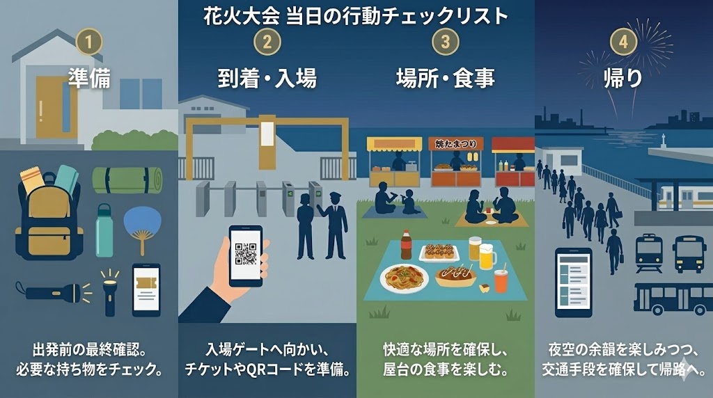 - 食事は打ち上げ直前ではなく、花火前の早い時間帯に済ませると動きやすい
