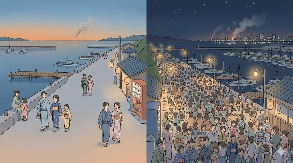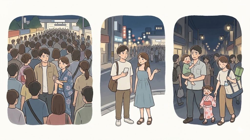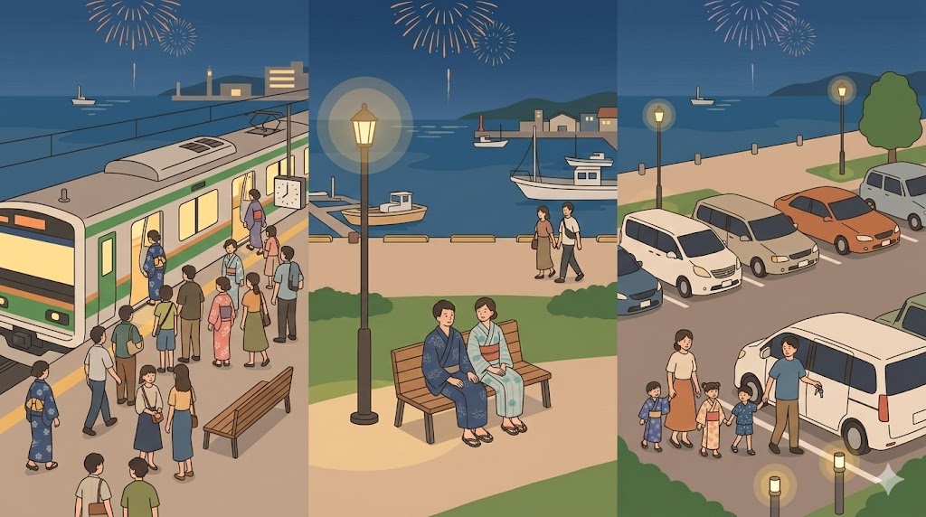 会場からの徒歩移動、周囲の人の流れ、駅方向への集中、列車に乗るまでの待ち時間など、帰宅は段階的に遅くなりやすくなります。フィナーレ重視なら、帰りの快適さではなく満足度を優先した選択になります。