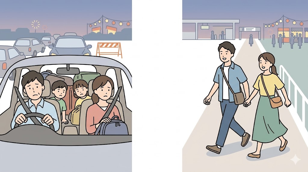 車向きなのは、会場から離れた場所に早めに止めて、途中から別手段へ切り替えられる人です。逆に、会場の近くまで寄せたい人には不向きです。