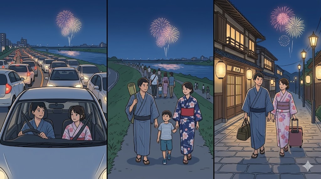 「駐車場が取れるか」だけで考えるより、「花火のあとに急いで帰らなくていいか」で考えると、手段を選びやすくなります。