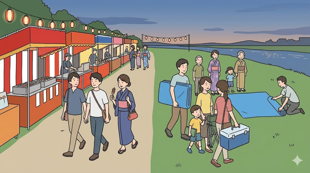 | 花火を落ち着いて見たい | 観覧位置を先に固めて、屋台は無理のない範囲にする | 直前に食事も場所取りも両立しようとすると忙しくなりやすい |