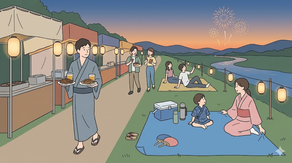 反対に、花火をしっかり見たい人は、屋台を無理に主役にしない方が満足しやすいです。食事は会場に入る前や、早い段階で済ませる意識の方が、観覧位置を落ち着いて決めやすくなります。