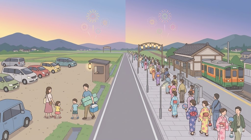 増田の花火では駐車場情報がありますが、それだけで車利用が有利とは言い切れません。