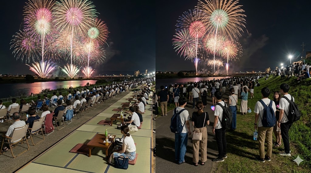 前年実績ベースでは、1マス単位でまとまって観覧できる桟敷席だったため、グループや家族単位での使いやすさが強みでした。座って見られること自体が、花火大会ではかなり大きな差になります。