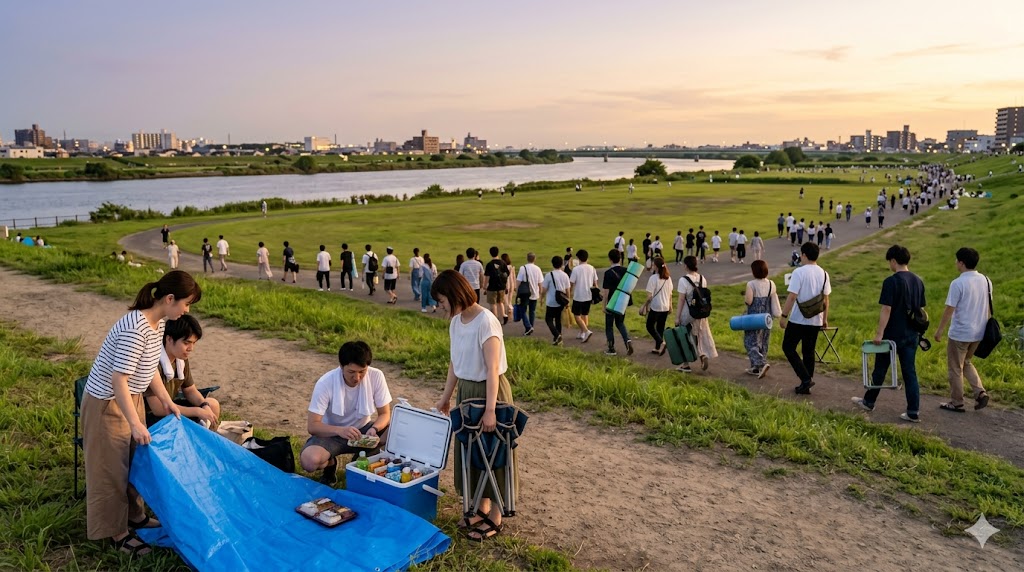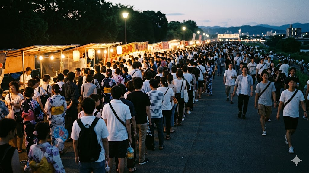 屋台目当てで行く場合でも、河川敷の観覧エリアに着いてから買おうと考える動きはおすすめしにくいです。今回の記事では、入力情報にある「会場内の観覧エリアには屋台の出店はない」という前提を軸にしつつ、今年の詳細案内が十分ではないため、会場内で自由に買い回れるような想定は置かずに整理します。