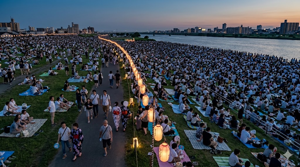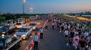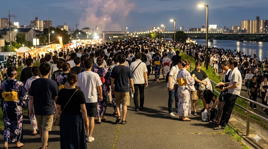 最後まで見ること自体はもちろん可能です。ただ、終了直後は観客が同じ方向へ動きやすく、徒歩動線と駅前待機の負担が一気に増えます。花火の余韻を楽しみながら帰るというより、まず歩く・並ぶ・進みにくい時間を見込む帰り方になります。前年公式でも打上終了後30分程度の分散退場協力が案内されていました。