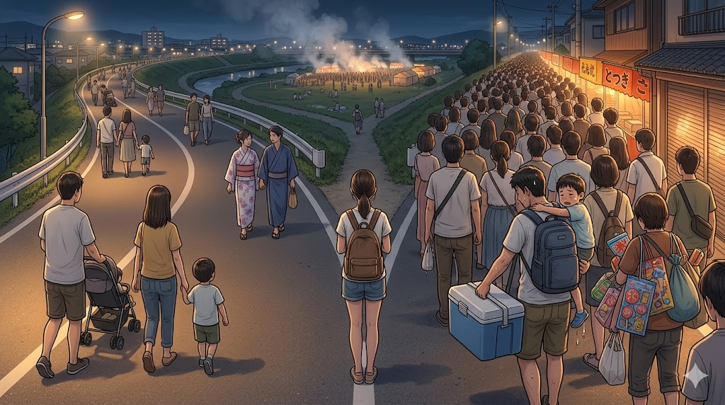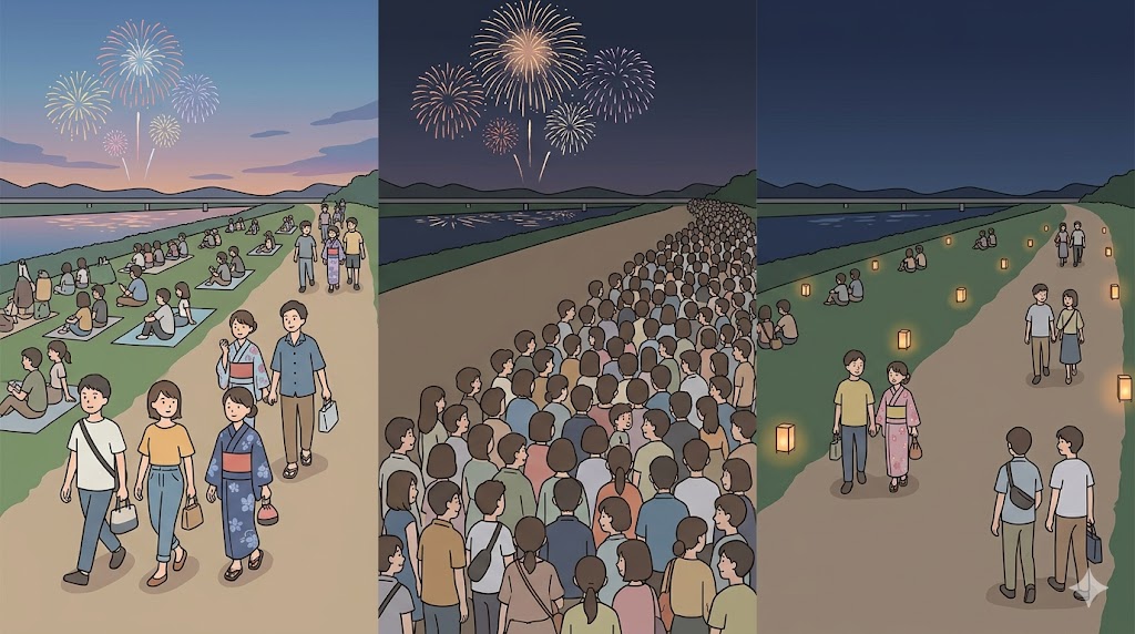 | 少し早めに動く | 子ども連れ、遠方移動、終電不安がある人 | 最後の打ち上げをしっかり見たい人 | 駅集中のピークを少し外しやすい |