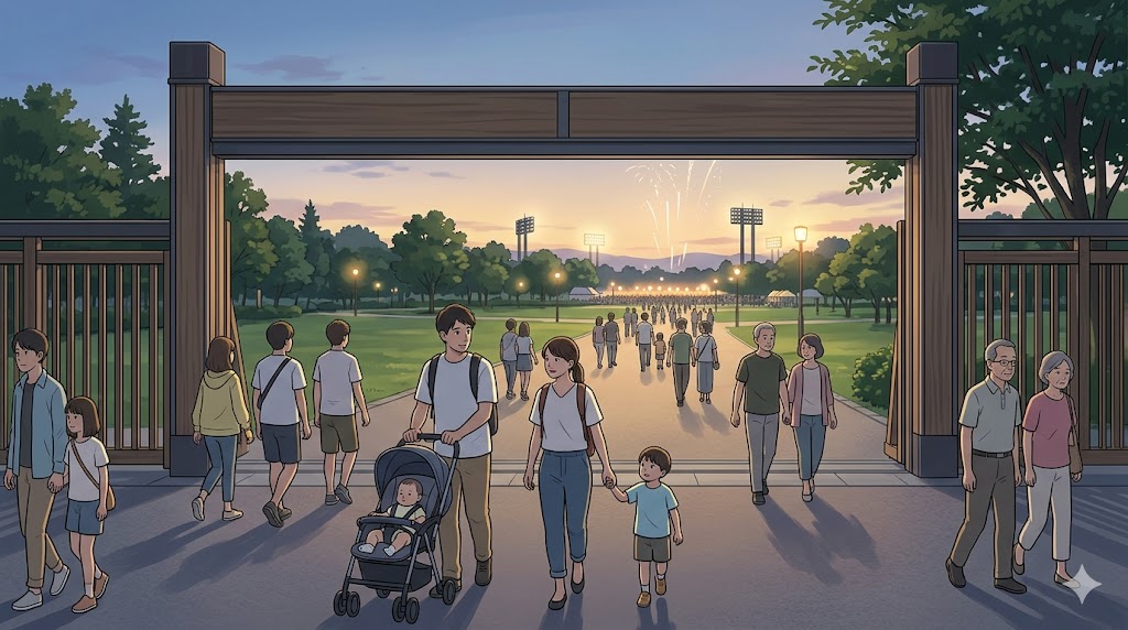この記事は、子連れで移動負担を減らしたい人と、できるだけ早く帰りたい人を主な読者として整理しています。たきの花火は広い公園型の会場なので、見え方だけでなく、入場条件や歩く距離、暗くなってからの移動まで含めて判断したほうが合う大会です。