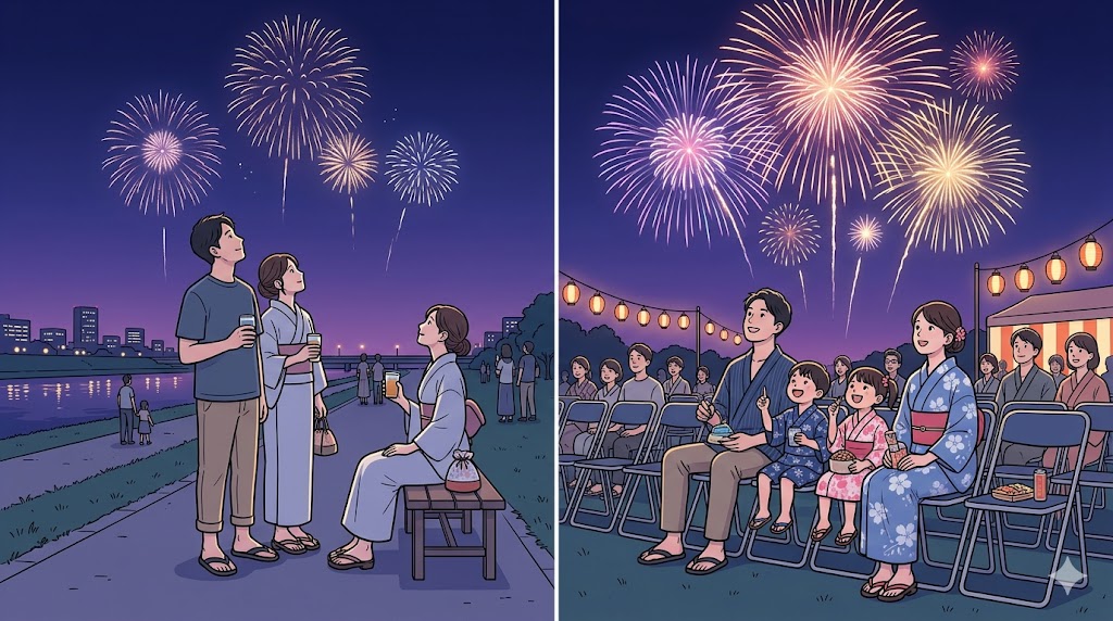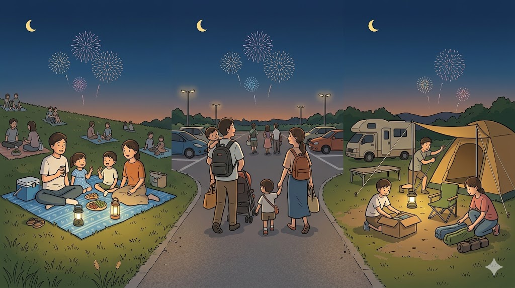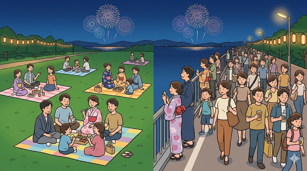 | 会場外観覧 | 少し見えれば十分な人、混雑回避を優先する人、帰りやすさ重視の人 | 花火をしっかり見たい人、子連れ、高齢者連れ | 見え方より安全性と移動負担の整理が重要だから |