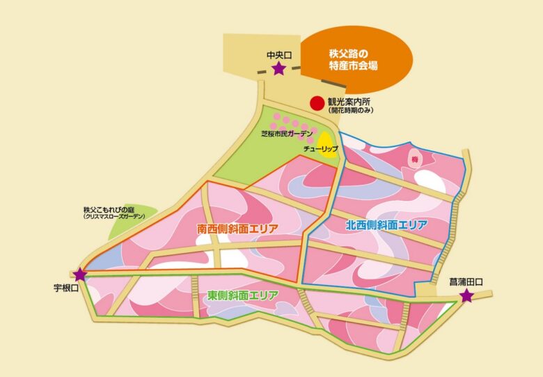 - 臨時駐車場を利用する:羊山公園内は大型バス優先で、一般車両は臨時駐車場を使います。臨時駐車場からは公園までのシャトルバスが運行していますが、こちらも混雑することが予想されますので、時間に余裕を持って行動しましょう。